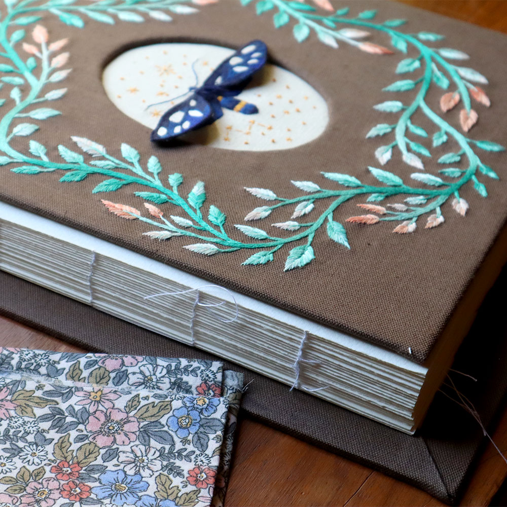 Große Stickprojekte kann man auch mit kleineren Stickrahmen besticken. Dafür muss man nur den Rahmen immer passend auf dem Stoff verschieben, bis alles gefüllt ist. Doch bei diesem Projekt hatte ich Bedenken, dass der Rahmen zu starke Abdrücke hinterlässt, wodurch der Bucheinband nicht so schön glatt geworden wäre.