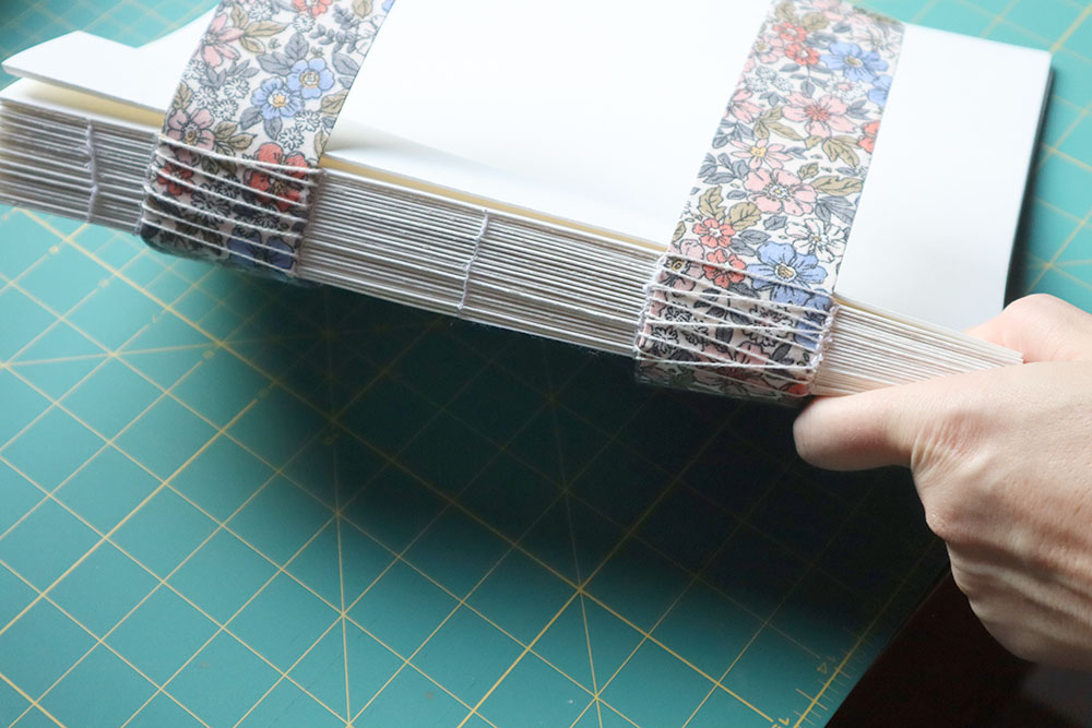 - diese 3 Stoffstreifen dann mit dem Buchblock zusammengenäht