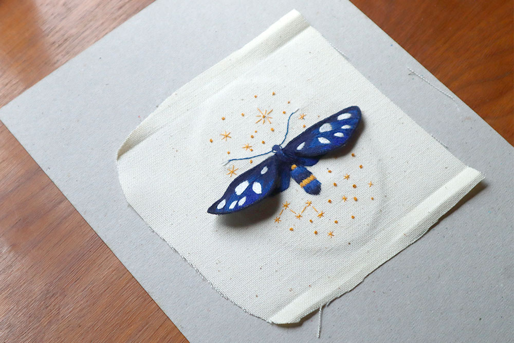 Für das Innere des Buchdeckels klebe ich noch meinen gestickten Schmetterling auf dieselbe Weise auf. Hier benutze ich dünnere Pappe von einem Schreibblock. Diese Pappe klebe ich dann wiederum von hinten auf den Umschlag, sodass der Schmetterling vorne durchguckt.