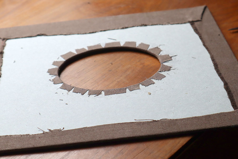 Damit der Stoff auch in der Mitte ausgeschnitten ist, schneide ich zuerst ein kleineres Oval mit ca. 1 bis 2 cm Abstand zum Karton aus. Dann schneide ich sehr vorsichtig kleine Schlitze bis zur Kante des Kartons hin. Mit dem Klebestift klebe ich dann alle entstandenen Keile auf der Innenseite des Umschlags fest. (siehe mittleres Bild oben)