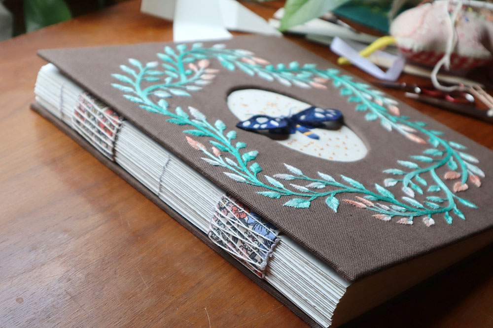 Seit Jahren bastle ich mir meine Projektbücher selbst. Meist beziehe ich sie mit Stoff oder schönem Papier. Manchmal überziehe ich ein fertiges Buch, manchmal binde ich die Seiten selbst. Für mein neues Großprojekt wollte ich aber etwas ganz Besonderes machen. Und so komisch es auch klingt, bestickt habe ich noch nicht viele Bücher!